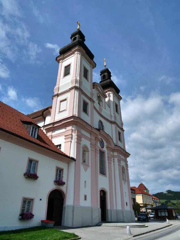 Als nächstes wollen wir in Kirchberg die Wehrkirche St. Wolfgang besichtigen. Diese kann aber nur zu bestimmten Zeiten im Rahmen einer Führung betreten werden. Wir geben stattdessen Feistritz am Wechsel als Ziel ins Navi ein. Dort spazieren wir zur Kirche (leider ebenfalls geschlossen). Daneben befindet sich die alte Volksschule, die im nächsten Bild zu sehen ist.