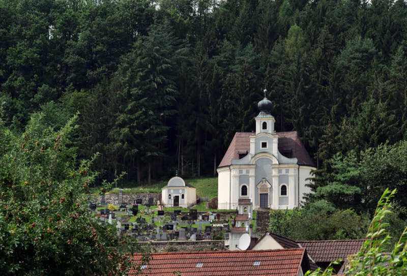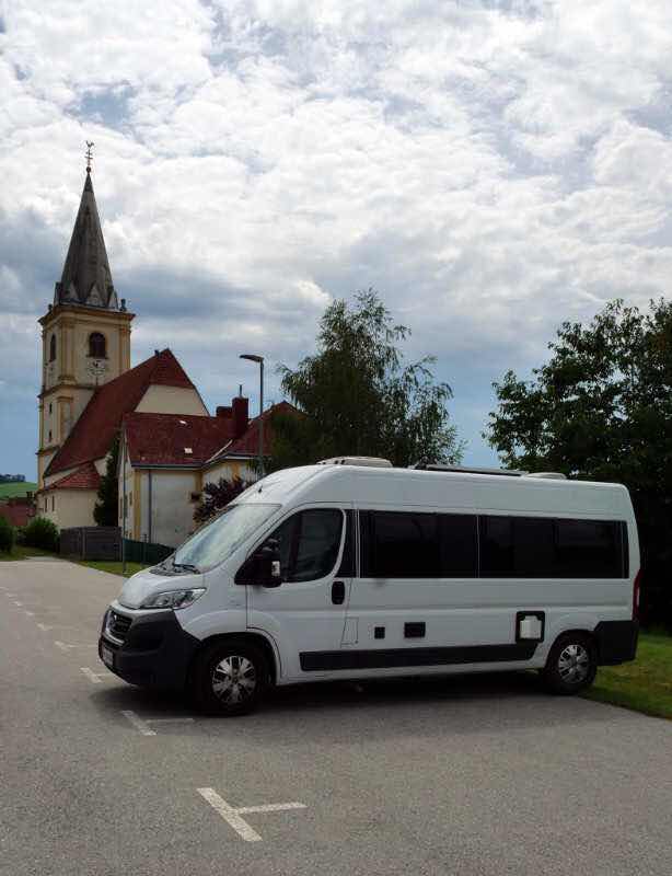 Es ist inzwischen 15 Uhr. Der Regen lässt weiterhin auf sich warten, was uns durchaus recht ist. Wir beschließen, noch eine Wehrkirche aufzusuchen (nämlich die in Lichtenegg) und dann einen Übernachtungsplatz in Grimmenstein anzusteuern, den wir in Park4Night gefunden haben. Unter dem Namen „Lichtenegg“ bietet das Navi mehrere Ziele zur Auswahl. Wir tippen auf das erste, das zwar in der richtigen Richtung liegt, aber kirchenlos ist. Mit Hilfe der genauen Adresse, die wir im Internet finden, gelangen wir aber doch noch zur Wehrkirche.