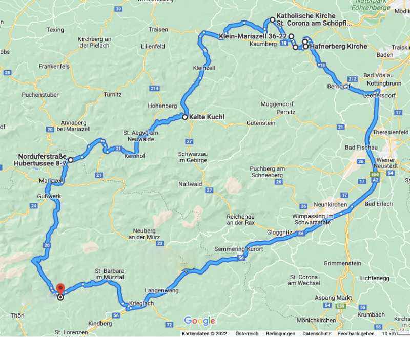 Über Veitsch erreichen wir die Autobahn im Mürztal, nehmen jedoch die Route über den Semmering. Beim Asfinag-Rastplatz kurz vor Wiener Neustadt legen wir eine Pause ein.