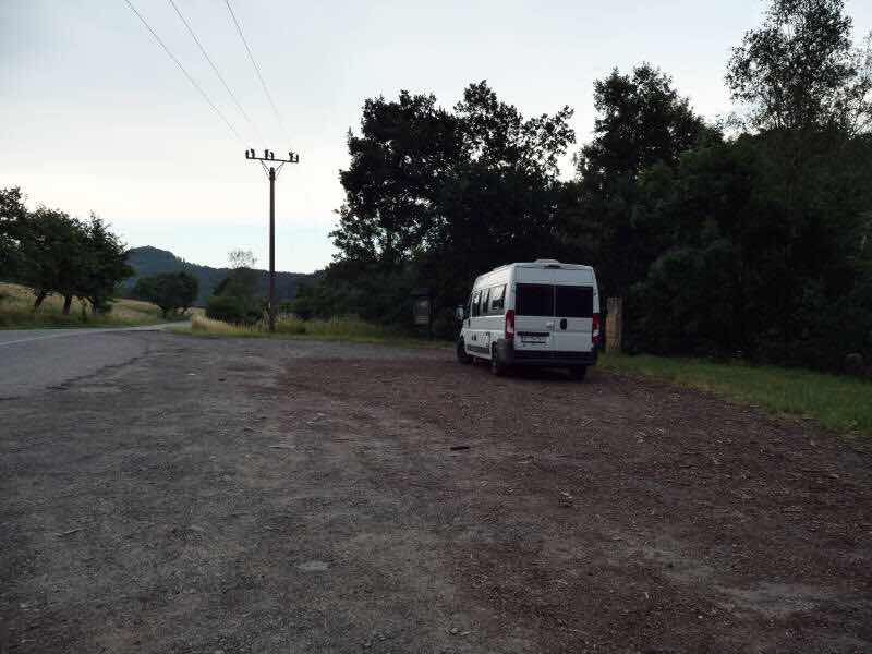 Nach dem Einkauf gebe ich einen Wanderparkplatz bei der Hasenburg ins Navi ein (auch wenn heute kein Tag zum Wandern, sondern ein Ruhetag ist). Da aber dort laut Womo-Reiseführer eine Parkgebühr fällig ist, halte ich kurz davor in Klapy bei einem Friedhof und höre mein Hörbuch weiter.